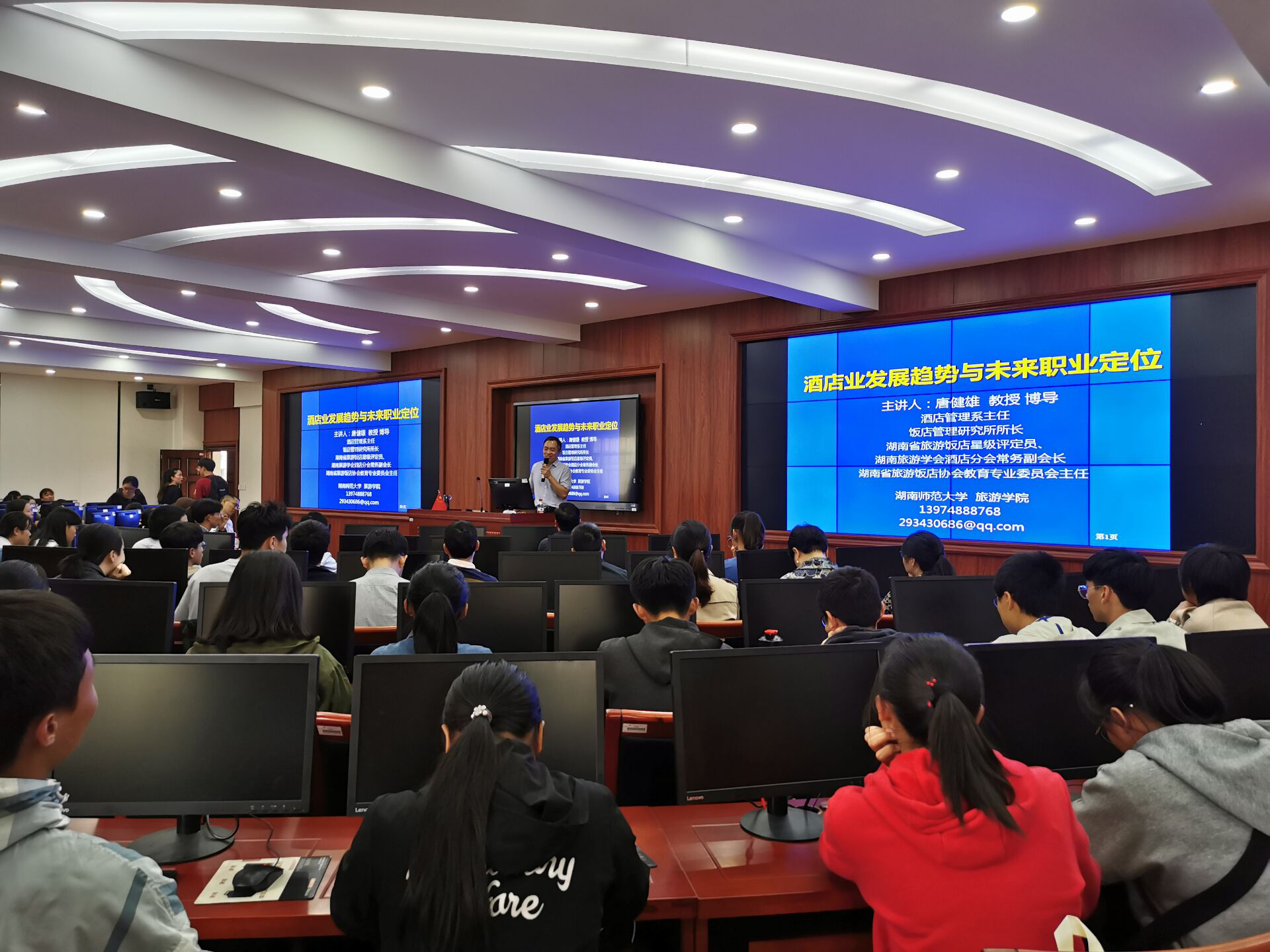 10月22日下午,beats365邀请到了湖南师范大学的唐健雄教授做了“酒店发展趋势与未来职业定位”的专题讲座,公司党总支书记王淑霞、副书记刘敬龙,旅游管理教研室主任、硕士生导师刘飞龙及旅游管理教研室的其他老师们到场,与全体2018级旅游管理专业的同学共同聆听本次讲座。