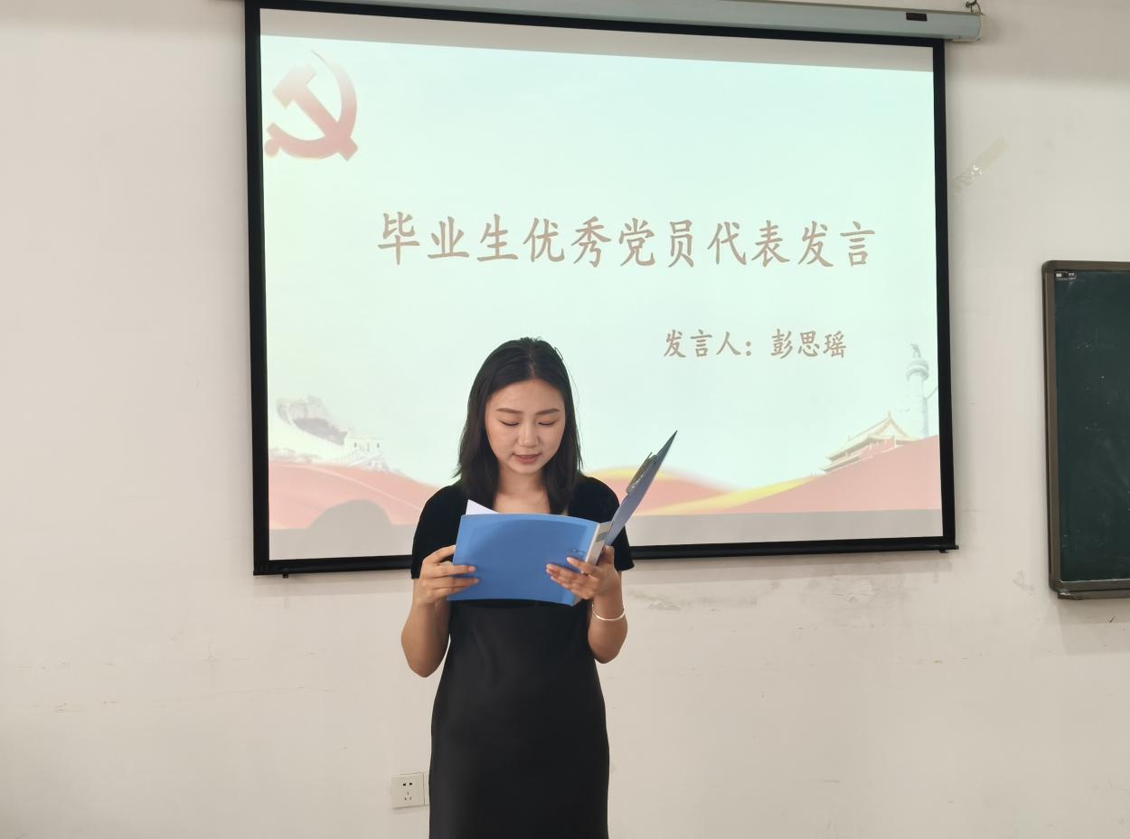 随后,优秀毕业生党员彭思瑶同学作为代表上台发言。彭思瑶同学以“全面发展,服务奉献”为题,回顾她从考研的坚韧、抗疫的担当,到创新大赛的永不言弃,用三个平凡却闪耀的故事,让我们看到了新时代青年党员的责任与光芒。