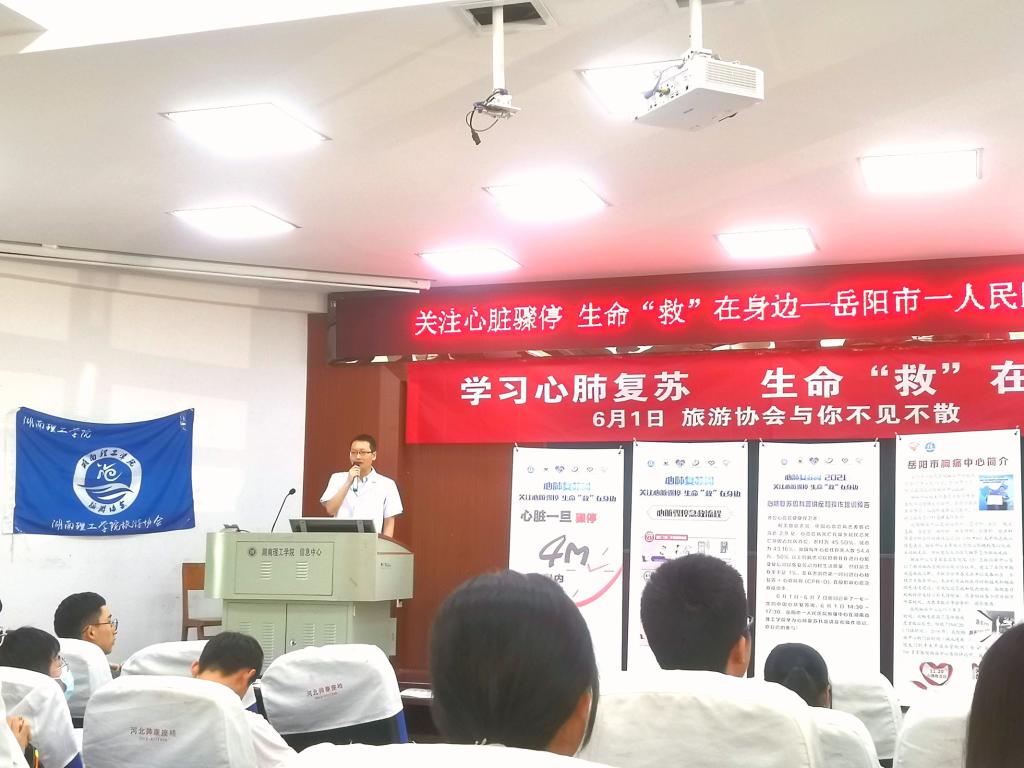 为加强同学们对突发事件的应急救治水平,更好地掌握急救知识与技能,6月1日下午,beats365旅游协会联合岳阳市一人民医院胸痛中心专家团队,在六栋学术报告厅成功举办了以“学习心肺复苏,生命‘救’在身边”为主题的公益大讲堂。