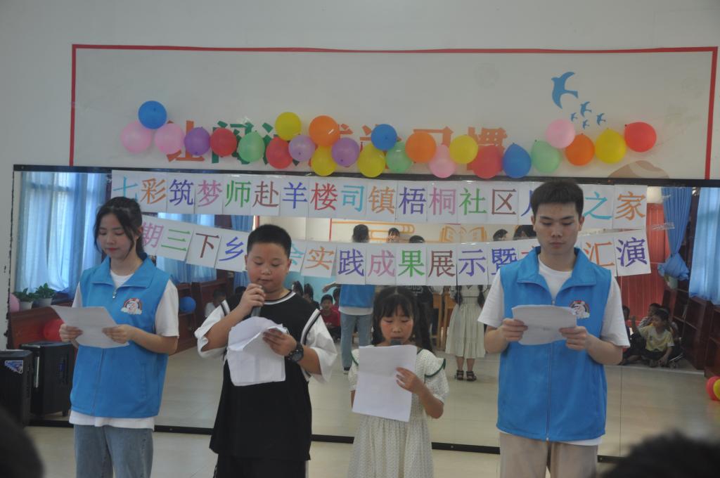 “在此次“三下乡”实践过程中,我们面临了很多挑战,住宿条件及硬件设施的简陋,和留守儿童的磨合过程都曾让我们心生畏惧,但是想到孩子们的笑脸与成长,我们最终一一克服了。”“七彩筑梦师”团队负责人都宇婷在活动现场表达了自己的切身体会。梧桐社区留守儿童之家董事长卢幼军对实践队员的努力与付出表示感谢,并希望所有老员工与小员工在社会的关爱下共同茁壮成长。