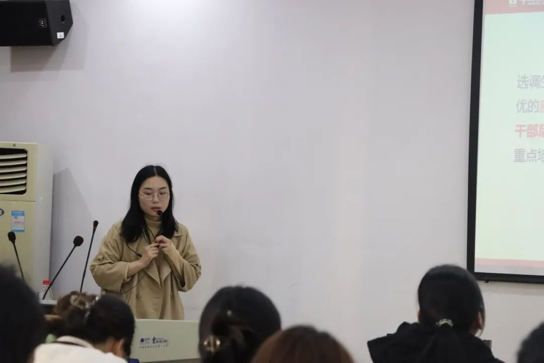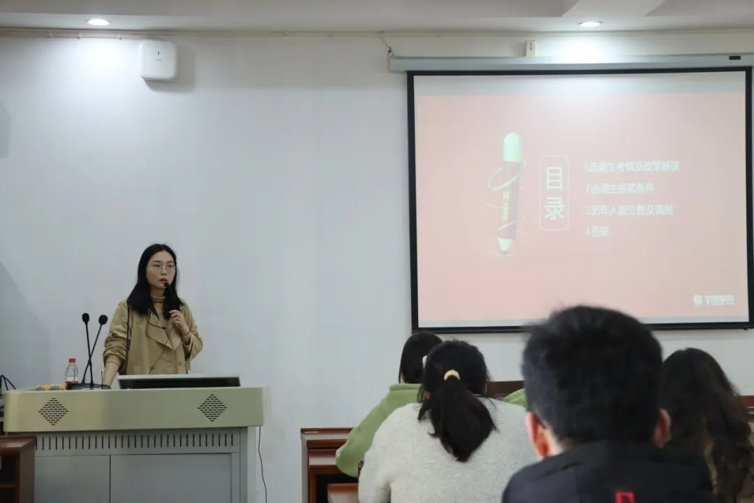华图教育老师以高度的政治责任感做好宣传动员和思想教育工作,从多个方面展开本次讲授,首先她简单地向同学们解释了何为选调生,为何大学面向老员工开展选调生动员大会。从选调对象、选调条件、选调程序三个层面分析。老师表示:“选调生动员大会既是一项重要而严肃的政治任务,又是公司就业工作的重要项目。”她将选调工作的重要意义、政策要求等向每一位毕业生宣讲到位,动员符合条件的优秀毕业生积极报名。