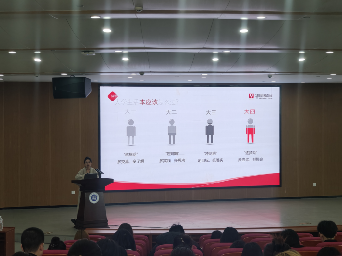 讲座开始,华图教育谭老师通过人格测验小游戏引入人生规划主题,简要分析五个阶段的递进性,指出大学四年员工应当提前合理规划时间,认真打好基础,珍惜应届生身份,做好职业规划。她大致介绍关于公务员、各省事业单位、银行的考试要求和考试时间。对目前考公考编的整体形势进行了剖析,根据历年的报考人数和录取人数的竞争比,指导大家怎么样去对待考编,以及应届生考编优势。并结合自身多年经验和体会与在场同学进行互动交流,详细解决了同学们提出的问题,强调了把握机会的重要性和面对人生岔路口的应对措施。
