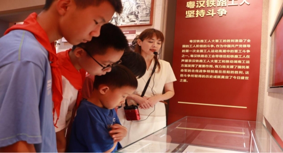 展陈馆内,一幅幅珍贵的历史照片、一件件真实的文物展品,生动地再现了当年粤汉铁路工人英勇抗争、争取权益的壮丽篇章。在讲解员的引导下,小朋友们认真聆听郭亮等革命先驱的故事,他们的眼中闪烁着对英雄的敬仰与对历史的好奇。