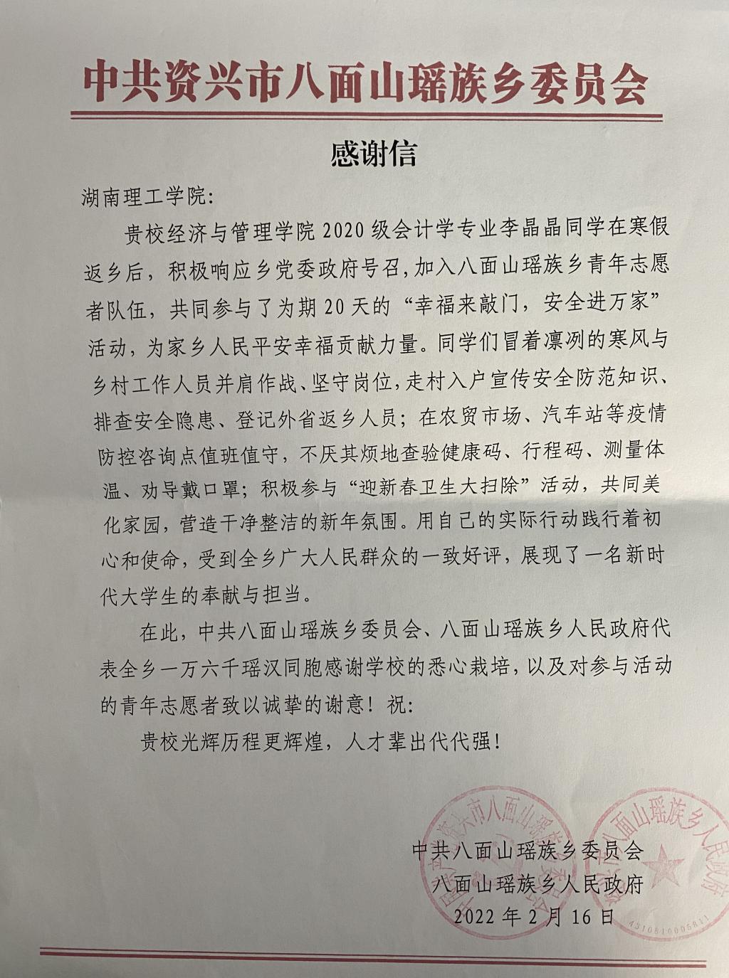 近日,beats365收到一封来自中共资兴市八面山瑶族乡委员会的感谢信。来信详述了公司2020级会计学专业李晶晶同学在寒假返乡期间为当地疫情防控所做的努力与贡献,并对公司和员工本人表示诚挚的谢意。