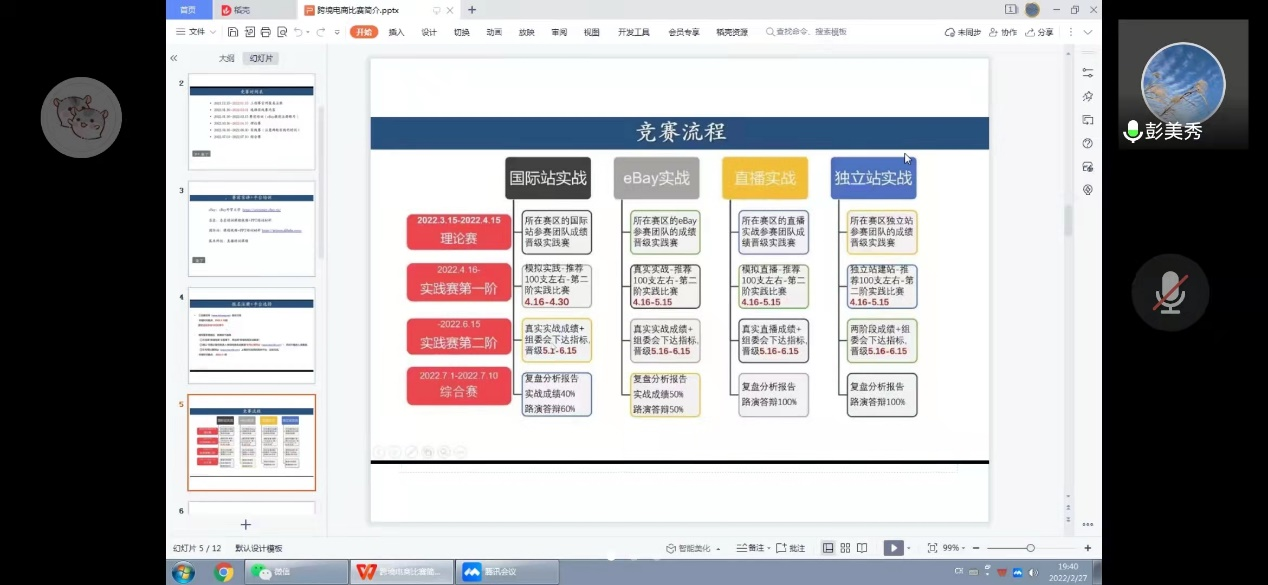 会上,彭美秀老师详细讲解了今年新增加的三创大赛的跨境赛道的区别和参赛模式,重点介绍了公司历年来在电子商务大赛中取得的优异成绩,并从大赛的作品选题、项目培育、项目创新点挖掘以及专业团队打造等方面进行了详细讲解。她指出,一个好的竞赛作品需要多方联动,早谋划、早动员,做好项目挖掘、项目培育。杨继莲老师结合自身指导员工参赛的经验,从比赛流程、两类比赛的区别与联系、基本规则、项目参赛组别选择、社会热点与产品贴合度等方面与参会的老师们进行了深入交流和探讨。