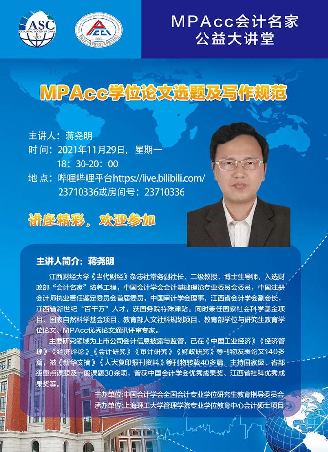 本次大讲堂主题为“MPAcc学位论文选题及写作规范”。讲座中,蒋教授结合研究生们论文中常见的问题和误区,详细讲解了学术论文写作规范和写作技巧,有针对性地给出了写作建议和方法。蒋尧明教授的讲座让同学们了解了学术论文撰写的具体方法、对论文的写作规范和要求有了更为深刻的理解。