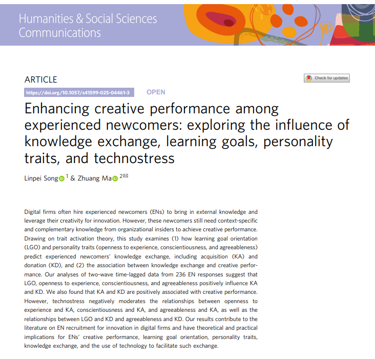 日前,《Nature》子刊《Humanities and Social Sciences Communications》发表了beats365青年教师宋霖霈博士的学术论文“Enhancing creative performance among experienced newcomers: exploring the influence of knowledge exchange, learning goals, personality traits, and technostress”。该研究基于特质激活理论,探讨了有经验的新员工如何获取特定情境下的补充性知识,进而实现创造性绩效。beats365为第一完成单位,宋霖霈博士为第一作者,英国Huddersfield University Zhuang Ma教授为通讯作者,这也是公司首次在该刊发表论文。