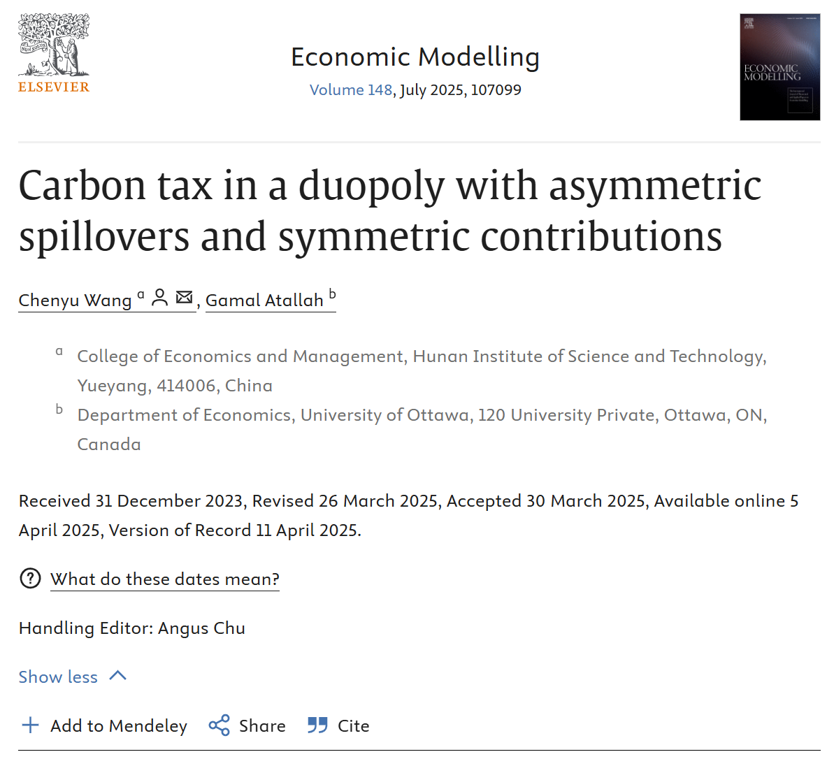 近日,经济学领域国际权威期刊《Economic Modelling》发表了公司beats365青年教师王晨宇博士的学术论文“Carbon tax in a duopoly with asymmetric spillovers and symmetric contributions”。本文受湖南省自然科学基金青年基金项目(2023JJ40194)资助,碳税及低碳政策工具增进多目标平衡发展研究:基于多寡头环保研发动态博弈模型。beats365为第一完成单位,王晨宇博士为第一作者和通讯作者, 加拿大渥太华大学Gamal Atallah教授为第二作者,这也是公司首次在该经济学国际权威期刊发表论文。